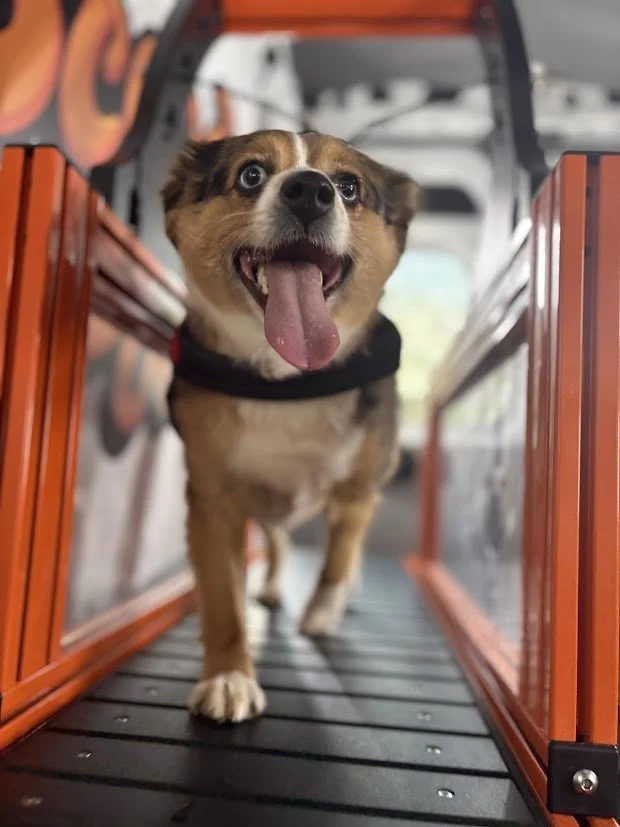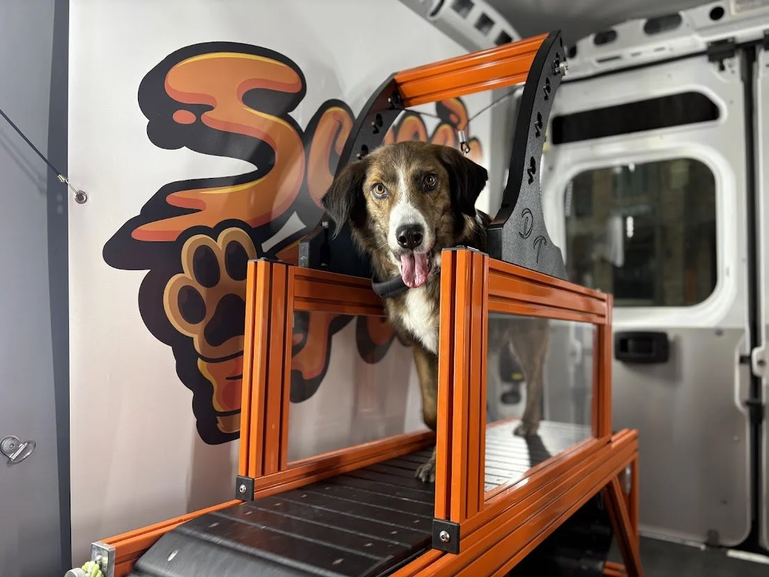 A mobile dog gym is exactly what it sounds like — a climate-controlled gym for dogs that comes directly to you. These specialized vehicles are equipped with dog-powered treadmills (often called slatmills) designed specifically for canine movement, allowing dogs to run safely at their own pace.
